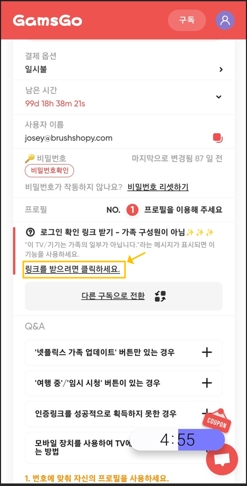 갬스고 사이트에 들어가서 로그인하고 [나의 구독]을 누르면 아래 갬스고 화면이 나오는데 화면 중간의 [링크를 받으려면 클릭하세요]를 누르면 네 자리 숫자가 나타납니다. 이것이 위에서 말한 인증번호입니다.