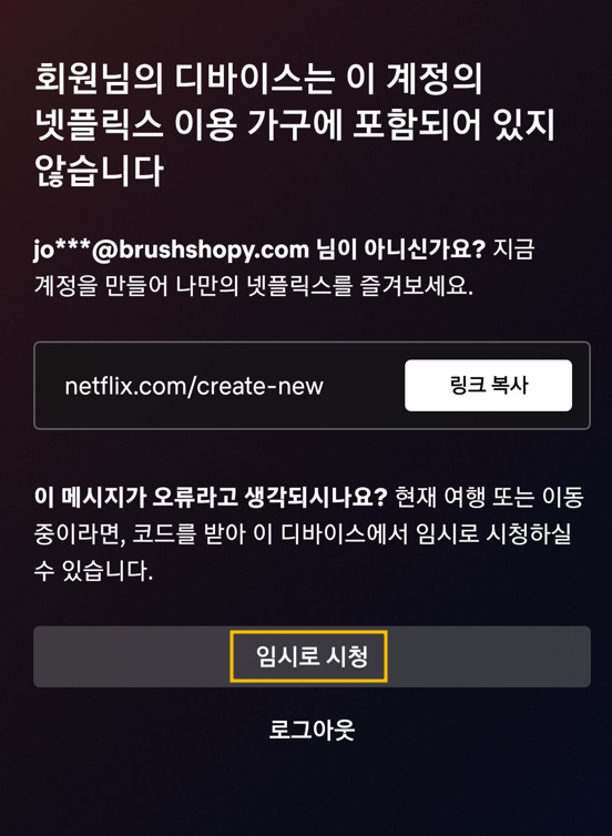 스마트폰 등으로 넷플릭스를 시청하다가 아래와 같이 "회원님의 디바이스는 이 계정의 넷플릭스 이용 가구에 포함되어 있지 않습니다."라는 화면이 나타나면 화면 아래에 있는 [임시로 시청]을 누릅니다. 그러면 네 자리 인증번호를 입력하게 되어 있는데 그 인증번호는 갬스고 사이트에 로그인해서 확인할 수 있습니다.