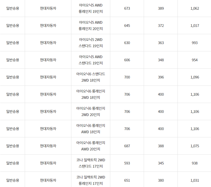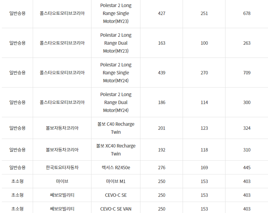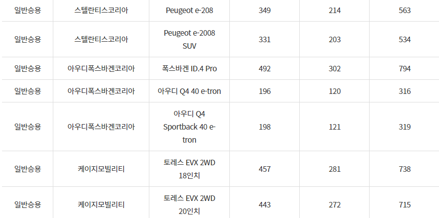 2024년 가평군 전기차 보조금입니다. 차종별로 국비 지원과 지방비 지원금 내역입니다.