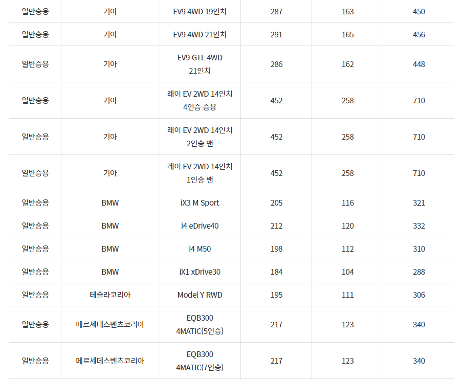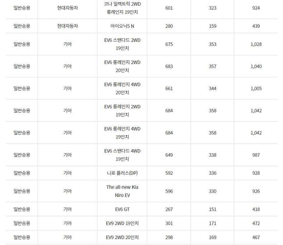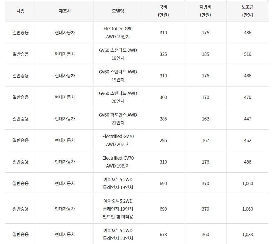 2024년 광주광역시 전기차 차종별 보조금 (국비+지방비)