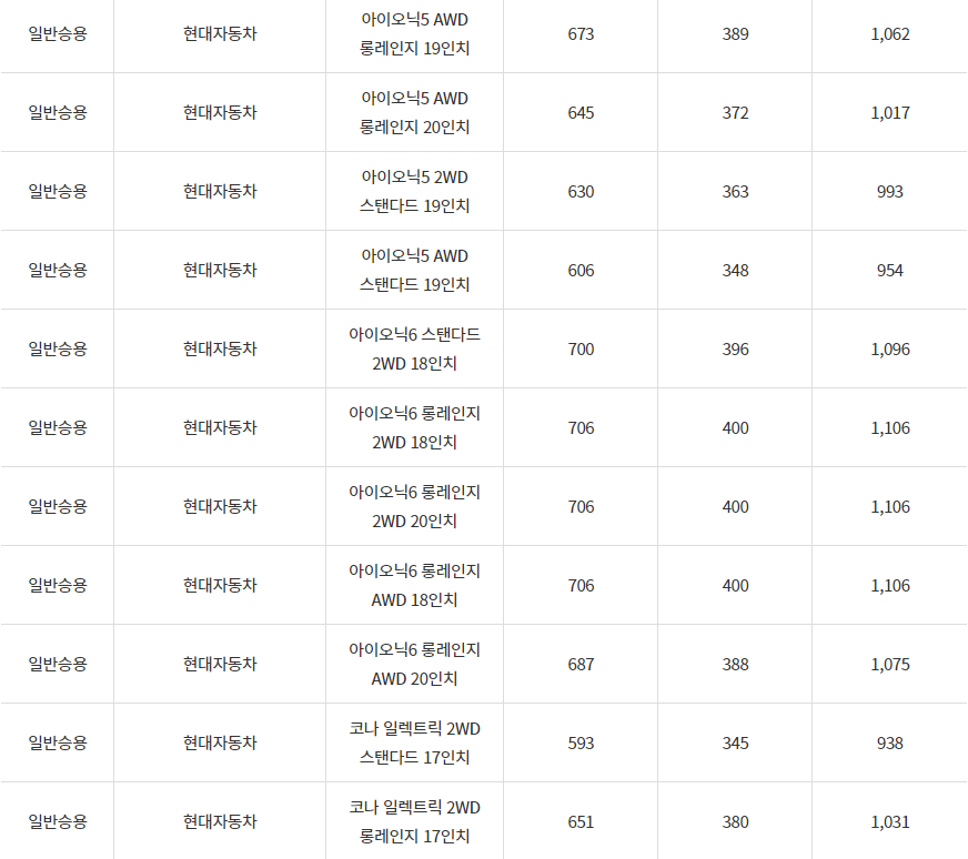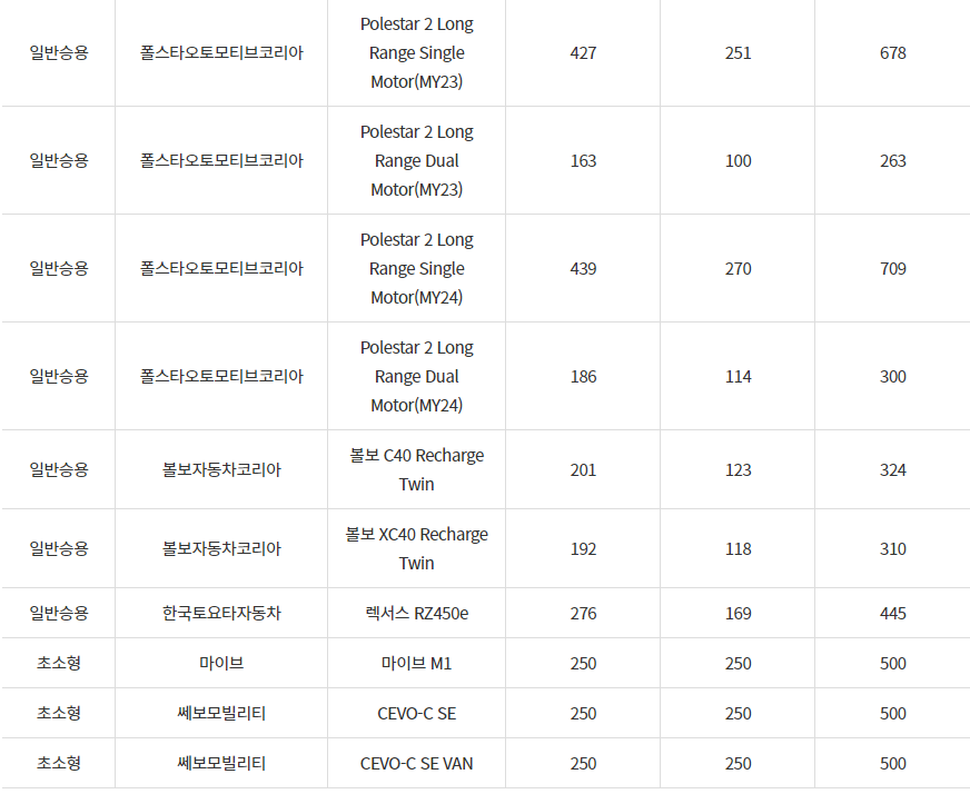 2024년 구리시 전기차 차종별 보조금 (국비+지방비)