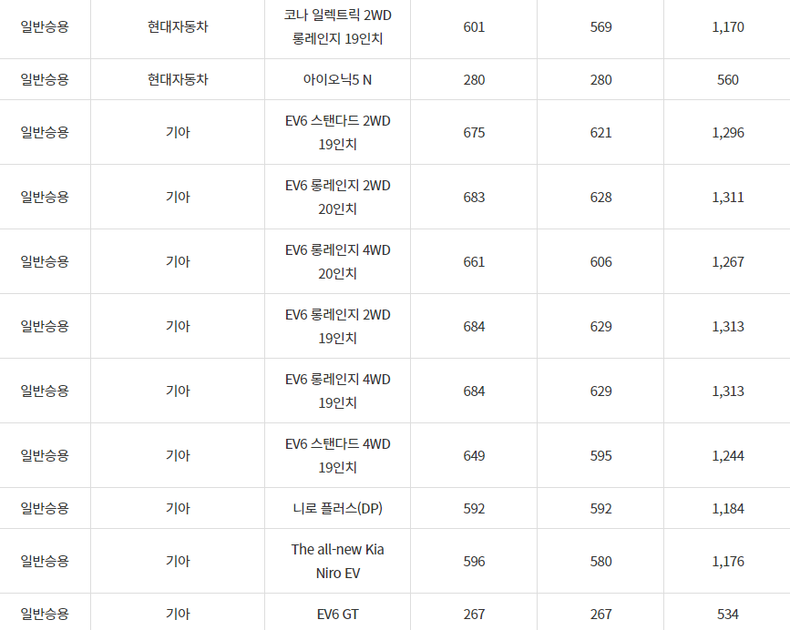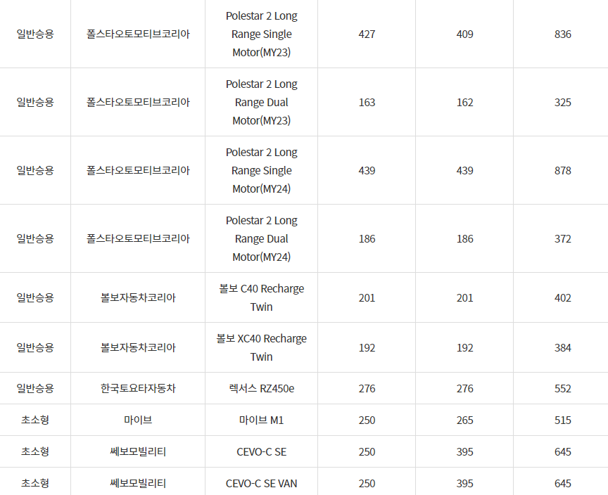 2024년 목포시 전기차 차종별 보조금 (국비+지방비)