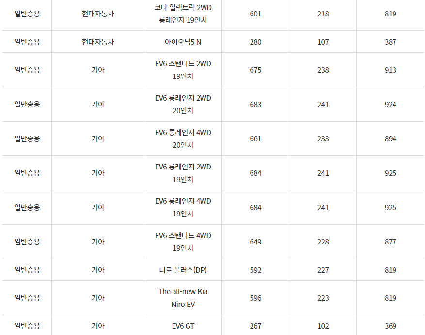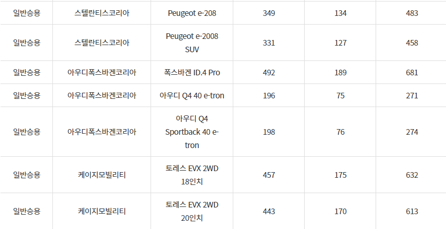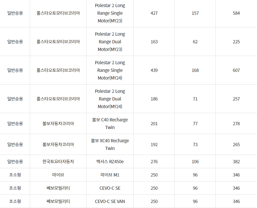 2024년 부천시 전기차 차종별 보조금 (국비+지방비)