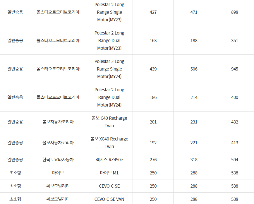 2024년 신안군 전기차 차종별 보조금 (국비+지방비)
