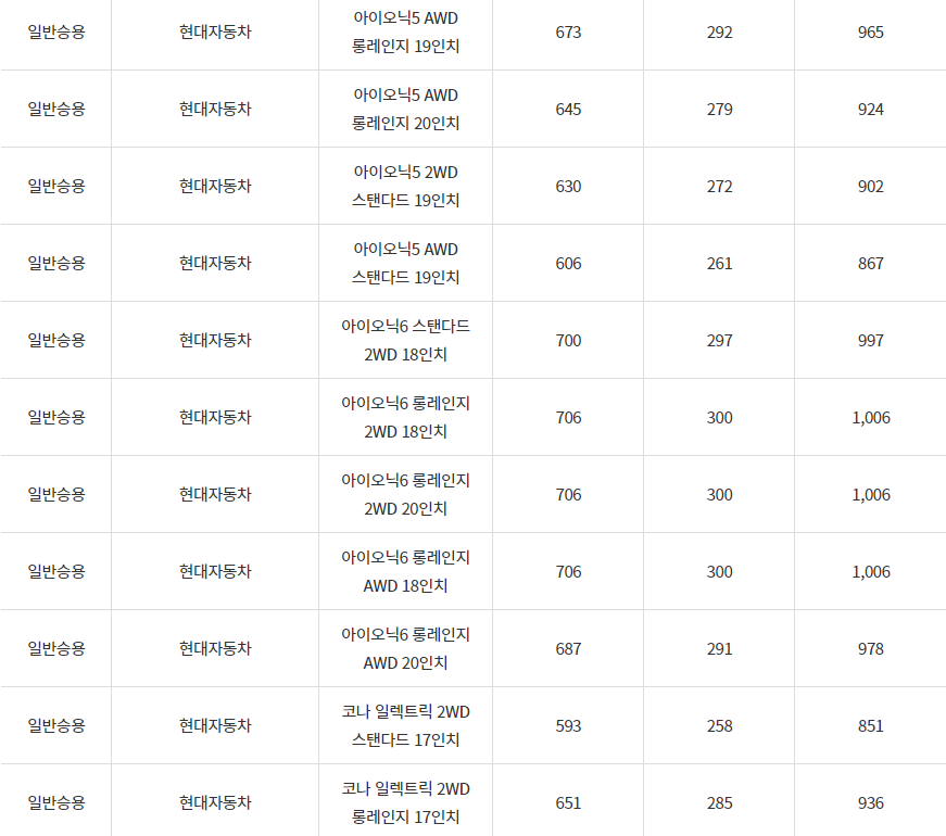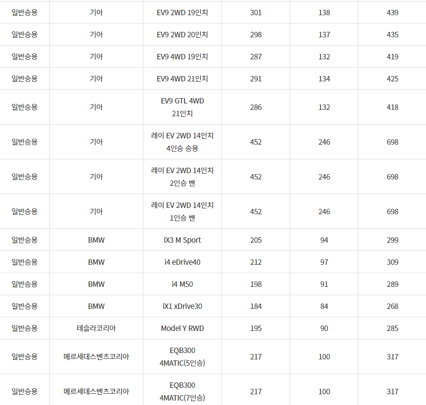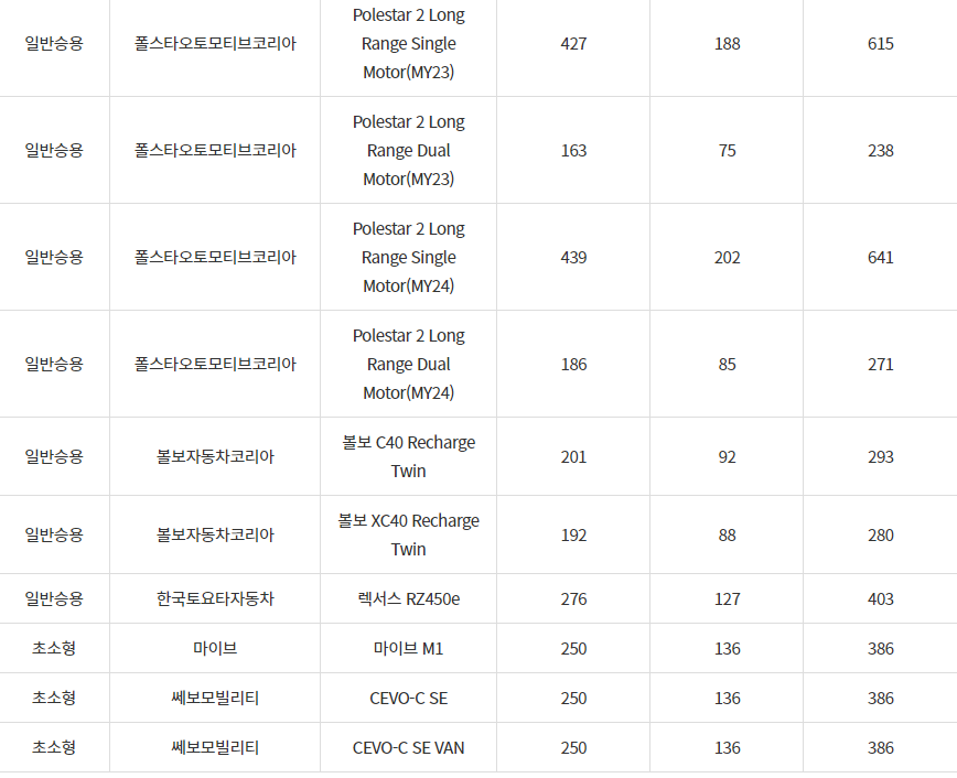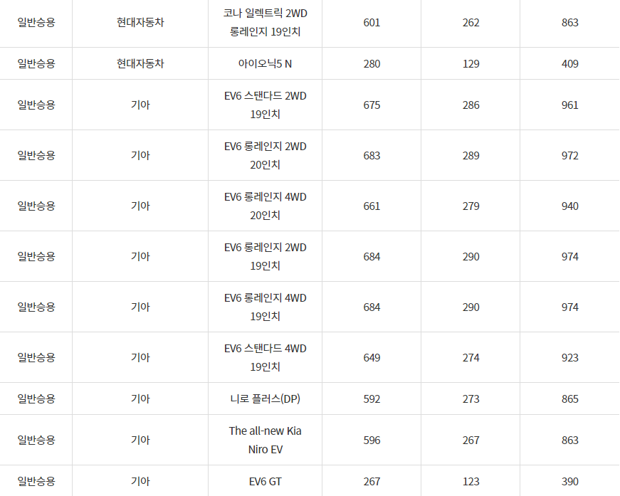 2024년 안산시 전기차 차종별 보조금 (국비+지방비)