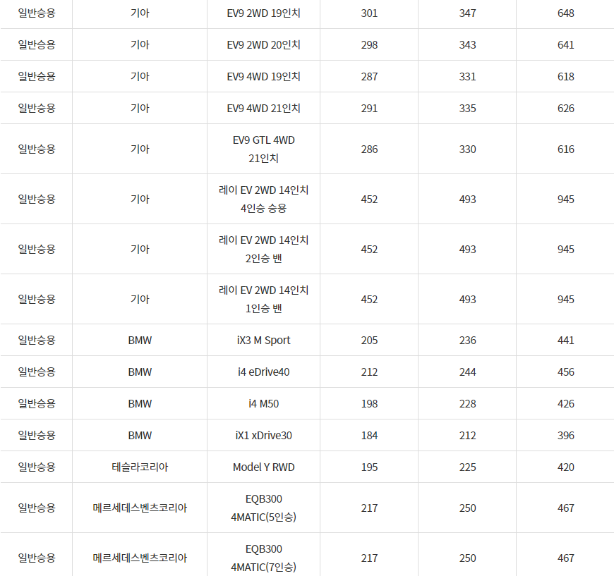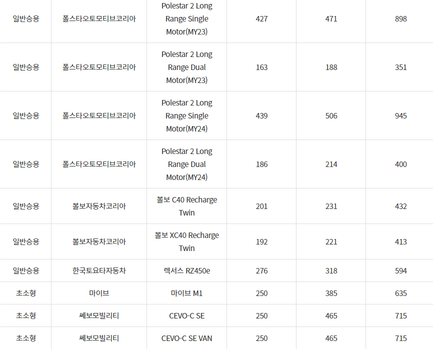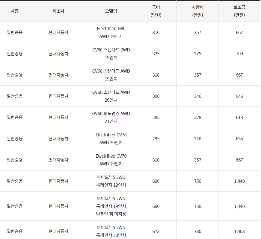 2024년 영광군 전기차 차종별 보조금 (국비+지방비)