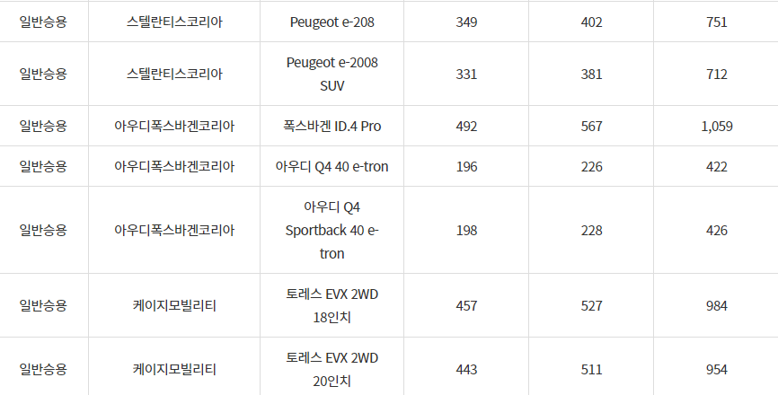2024년 화순군 전기차 차종별 보조금 (국비+지방비)
